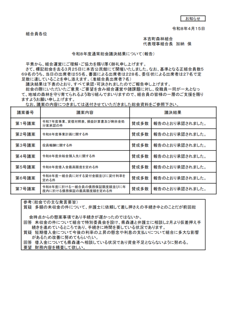 令和8年度通常総会の議決結果についてご報告いたします。