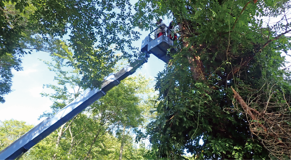 ● 高所作業車や昇り技術を使い、周囲を傷つけずに伐採